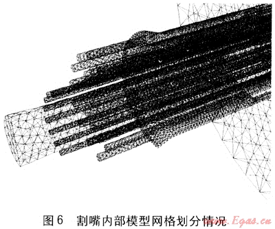 本文應(yīng)用CFD軟件對(duì)割嘴內(nèi)外圈氧氣與丙烷的流動(dòng)和燃燒做了冷態(tài)、熱態(tài)模擬。模擬計(jì)算的模型包括割嘴內(nèi)部氣體流場(chǎng)和割嘴外部空間氣體流場(chǎng)兩部分,因?yàn)楦钭焓侵行膶?duì)稱的,所以只模擬整個(gè)割嘴的一半。總體幾何模型見(jiàn)圖3,其中割嘴外部空間是直徑為200mm,長(zhǎng)度為1600mm的半圓柱體。割嘴內(nèi)部模型見(jiàn)圖4,包括高壓切割氧孔道、內(nèi)外圈預(yù)熱氧孔道、燃?xì)饪椎?。三維網(wǎng)格劃分情況見(jiàn)圖5、6,其中圖6是圖5的局部放大圖。