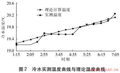 某日冷水機(jī)組關(guān)機(jī)后,不同時(shí)刻冷水實(shí)測溫度與由式(5)計(jì)算得到的理論溫度的比較見圖2。由圖2可知,實(shí)測溫度與由式(5)計(jì)算得到的理論溫度吻合較好,因此可采用式(5)計(jì)算停機(jī)后某時(shí)刻冷水溫度。