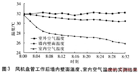 2006年8月7日對(duì)風(fēng)機(jī)盤管工作后墻內(nèi)壁面溫度、室內(nèi)空氣溫度的實(shí)測結(jié)果見圖3。由圖3可知,墻內(nèi)壁面實(shí)測初始溫度為31.8℃,實(shí)測室內(nèi)初始空氣溫度為31.6℃。隨著風(fēng)機(jī)盤管的開啟,墻內(nèi)壁面溫度平緩下降,30min后降至30.5℃,由于時(shí)間較短,可以近似認(rèn)為墻內(nèi)壁面溫度保持不變。風(fēng)機(jī)盤管工作30min后,室內(nèi)空氣溫度由31.6℃降至26℃,風(fēng)機(jī)盤管工作時(shí)間與計(jì)算結(jié)果(18~23min)相差不大。