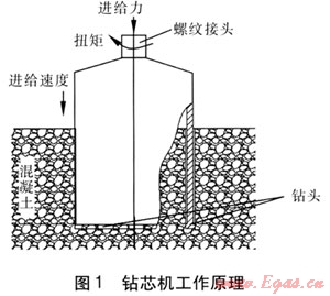 鉆芯機(jī)是以表鑲金剛石切割筒式高性能鉆頭旋轉(zhuǎn)切割鉆進(jìn)的機(jī)械,工作原理見(jiàn)圖1。機(jī)體通過(guò)軸的傳遞給切割筒式鉆頭施加一定的壓力和扭矩,鉆頭旋轉(zhuǎn)向下切割路面,使路面出現(xiàn)一個(gè)圓形切割縫和圓柱形芯塊,鉆到底后將芯塊提取出來(lái),便可對(duì)埋在正下方的管道進(jìn)行施工。在鉆進(jìn)過(guò)程中,以水作為鉆頭的冷卻液,這些水還可以清洗孔底,具有排屑、潤(rùn)滑鉆頭的作用。