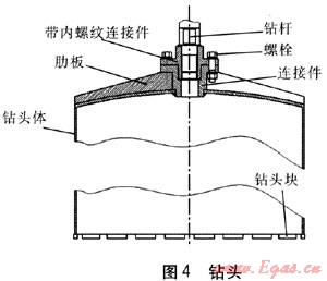 鉆頭為表鑲金剛石切割筒式高性能鉆頭,是鉆芯機(jī)直接切割混凝土芯塊的刀具。切割鉆進(jìn)混凝土的效率、鉆進(jìn)速度及鉆頭壽命,在很大程度上與鉆頭結(jié)構(gòu)形式及材料狀況有關(guān),因此鉆頭設(shè)計(jì)非常重要。從鉆芯機(jī)工作時(shí)的受力情況來(lái)看,鉆頭承受著很大的軸向載荷及摩擦力,因此,要求鉆頭體有較高的表面硬度、較好的耐磨性及足夠的剛度,不易發(fā)生變形,按此要求設(shè)計(jì)的鉆頭見(jiàn)圖4,其中,鉆頭塊含金剛石和胎體。