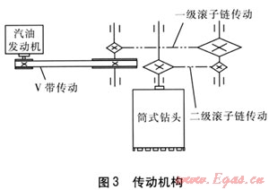 傳動(dòng)機(jī)構(gòu)采用V帶傳動(dòng)和兩級(jí)滾子鏈傳動(dòng),通過(guò)多級(jí)減速傳動(dòng)輸出,帶動(dòng)筒式鉆頭旋轉(zhuǎn)切割,傳動(dòng)機(jī)構(gòu)見(jiàn)圖3。