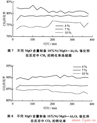 圖7、圖8為不同含量MgO-Al203載體制成10%Ni/MgO-Al203催化劑在反應(yīng)中CH4和CO2的轉(zhuǎn)化率。從圖7、8中可以看出,在反應(yīng)過程中10%Ni/4%MgO-Al203催化劑的催化活性最高,CH4和CO2轉(zhuǎn)化率分別為82%和90%左右。隨著反應(yīng)的進(jìn)行,10%Ni/4%MgO-Al203催化劑的催化活性略有浮動(dòng),但其轉(zhuǎn)化率仍然較高,在整個(gè)反應(yīng)過程中催化劑的催化活性變化都不是很大,表明其穩(wěn)定性較好。