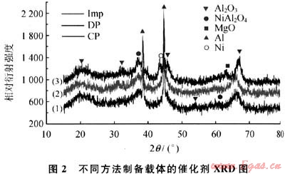 圖2為不同方法制備4%MgO-Al203載體制成催化劑的XRD譜圖。通過與標(biāo)準(zhǔn)譜圖進(jìn)行對(duì)比可以得知這3種催化劑中都存在Ni、Al、MgO、Al203、NiAl2O4相,其中,當(dāng)2θ為36°處存在NiAl2O4尖晶石的衍射峰,共沉淀法制備的載體催化劑的NiAl2O4衍射峰最弱,而其他兩種方法NiAl2O4的衍射峰逐漸增強(qiáng),說明Ni與Al2O3的相互作用較強(qiáng),使活性中心Ni的含量較少,進(jìn)而影響其催化劑的催化活性。