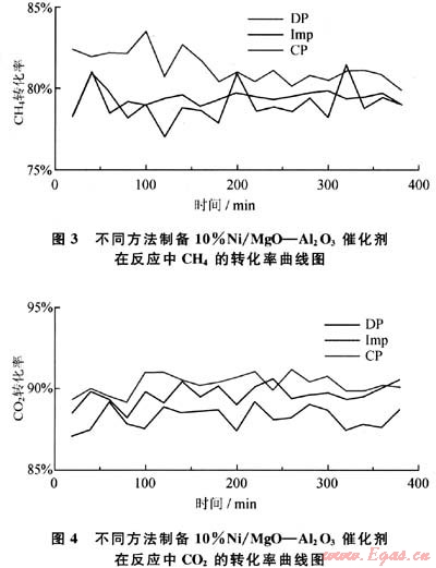用不同方法制備4%MgO-Al203載體,用浸漬法負(fù)載Ni,制備成10%Ni/4%MgO-Al203催化劑,在常壓固定床反應(yīng)器中測得CHn的轉(zhuǎn)化率(XCH4)和C02的轉(zhuǎn)化率(XCO2)(圖3、4)。從圖3、4中可以看出,在反應(yīng)開始階段共沉淀法制備的載體催化劑的初始活性較高,可以超過90%,高于沉積沉淀法和浸漬法的催化活性,隨著反應(yīng)時(shí)間的進(jìn)行,CH4和C02的轉(zhuǎn)化率始終保持較高,但反應(yīng)進(jìn)行4h后,催化劑發(fā)生了積炭,催化活性有所降低,說明其穩(wěn)定性不是很好。