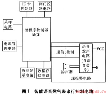 智能語(yǔ)音燃?xì)獗砜刂齐娐分饕呻娫垂芾黼娐?、采樣電路、液晶顯示電路、數(shù)據(jù)存儲(chǔ)電路、IC卡控制電路、閥門(mén)控制電路及報(bào)警電路組成MCU的外圍電路組成,這些電路由MCU進(jìn)行統(tǒng)一管理,協(xié)調(diào)各部分電路的工作。語(yǔ)音燃?xì)獗砭褪菍⒃瓐?bào)警電路部分去掉,用現(xiàn)報(bào)警電路替代,以實(shí)現(xiàn)語(yǔ)音報(bào)警功能。