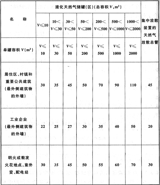4.3.8 液化天然氣氣化站的液化天然氣儲罐(區(qū))與站外建筑等的防火間距不應(yīng)小于表4.3.8的規(guī)定,與表4.3.8未規(guī)定的其他建筑的防火間距,應(yīng)符合現(xiàn)行國家標(biāo)準(zhǔn)《城鎮(zhèn)燃?xì)庠O(shè)計規(guī)范》GB 50028的規(guī)定。