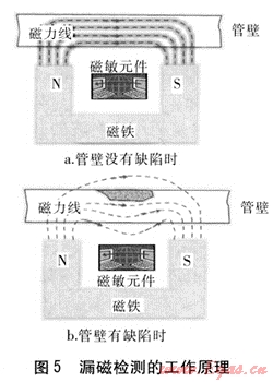 漏磁檢測技術(shù)建立在鐵磁材料的高磁導(dǎo)率特性之上,其工作原理見圖5。當(dāng)檢測裝置在管道內(nèi)行走時,通過檢測器所攜帶的強(qiáng)力永久磁鐵將管道磁化,使管道上產(chǎn)生一個縱向的磁場回路。當(dāng)管壁無缺陷時,磁力線絕大部分通過管壁,此時磁力線均勻分布;當(dāng)管壁有缺陷時,磁力線發(fā)生彎曲,并且有一部分的磁力線穿出管壁以外產(chǎn)生漏磁。通過檢測和分析逸出管壁的漏磁通量,就可以確定管道金屬損失的程度以及位置。