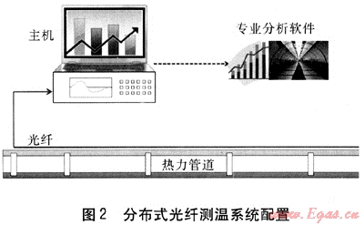 在使用分布式光纖測溫系統(tǒng)檢測管溝內(nèi)熱力管道時,可將測溫光纖傳感器沿?zé)崃艿啦荚O(shè),置于管道保溫層的表面,并每隔一定距離固定。固定時無特殊要求,原則是盡量讓測溫光纖傳感器貼近熱力管道,不要因重力而滑落即可,分布式光纖測溫系統(tǒng)配置見圖2。當(dāng)熱力管道的管子壁厚變薄、接頭斷裂或保溫層損壞后,會使得局部管段的溫度異常,測溫光纖傳感器能及時捕獲這些異常,反映在監(jiān)測站內(nèi)的主機(jī)中。通過圖形化的專業(yè)分析軟件,可以分析與提取出異常點的位置及溫度偏差,實現(xiàn)報警功能。若今后考慮采用分布式光纖測溫系統(tǒng)監(jiān)測直埋熱力管道,建議在熱力管道的下面同時埋設(shè)一根小直徑的鋼管,內(nèi)置測溫光纖傳感器,這樣在有供熱介質(zhì)泄漏時能及時發(fā)現(xiàn)漏點位置。