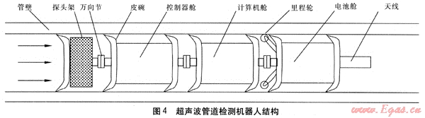 超聲波檢測法是利用超聲波的脈沖反射原理,通過超聲波在介質(zhì)中傳播時遇金屬表面發(fā)生部分反射的特性來測定管道的壁厚及管內(nèi)表面狀況的一種方法。管道內(nèi)檢測使用的超聲波檢測儀為管道內(nèi)通行的檢測機(jī)器人,超聲波管道檢測機(jī)器人是一種能夠遠(yuǎn)程控制、在管道內(nèi)行走、裝載有超聲波傳感器件的機(jī)構(gòu)(見圖4)[4]。檢測機(jī)器人由液體推動,由多節(jié)功能艙組成。主要包括探頭架、萬向節(jié)、皮碗、控制器艙、計算機(jī)艙、里程輪、電池艙、天線等。探頭架內(nèi)安裝有環(huán)向陣列超聲波檢測器,是檢測管道壁厚數(shù)據(jù)的來源;艙與艙之間以萬向節(jié)連接,便于通過管道轉(zhuǎn)彎部分;多個皮碗實現(xiàn)檢測裝置的密封;控制器艙內(nèi)安裝控制整套機(jī)構(gòu)動作的執(zhí)行元件;計算機(jī)艙負(fù)責(zé)接收外部指令并向控制器艙發(fā)送動作指令;里程輪用于計算從管道入口開始行走的距離;電池艙給管道內(nèi)整套檢測裝置供電;天線負(fù)責(zé)檢測機(jī)器人與地面控制裝置的通信。