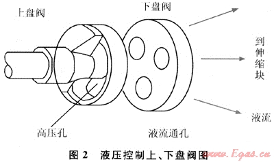 調(diào)制式旋轉(zhuǎn)導(dǎo)向鉆井工具(MRST)屬于推靠式旋轉(zhuǎn)導(dǎo)向鉆井工具(圖1)。由于其鉆柱與井壁之間不存在靜止點(diǎn),因此,在鉆井過程中更可體現(xiàn)旋轉(zhuǎn)鉆井的優(yōu)越性[1]。調(diào)制式旋轉(zhuǎn)導(dǎo)向鉆井系統(tǒng)導(dǎo)向力的大小和方向主要是由穩(wěn)定平臺(tái)控制的。當(dāng)需要最大導(dǎo)向力時(shí),穩(wěn)定平臺(tái)控制軸就帶動(dòng)上盤閥旋轉(zhuǎn),使上盤閥穩(wěn)定在預(yù)定方向,控制上盤閥高壓孔方向恒定。在鉆柱旋轉(zhuǎn)過程中,每個(gè)“巴掌”依次在該方向附近伸出拍打井壁,導(dǎo)向機(jī)構(gòu)對(duì)井壁的作用力就是這些拍打力的合力。這個(gè)合力的反力就是鉆柱受到的導(dǎo)向力,方向沿著上盤閥預(yù)定方向的反方向。當(dāng)不需要導(dǎo)向時(shí),穩(wěn)定平臺(tái)帶動(dòng)上盤閥以和鉆柱具有不同的某一轉(zhuǎn)速勻速轉(zhuǎn)動(dòng),這時(shí)“巴掌”均勻拍打井壁四周,導(dǎo)向工具可控制的液壓導(dǎo)向力的合力就等于零,此時(shí)導(dǎo)向工具呈中性工作狀態(tài),達(dá)到穩(wěn)斜效果。MRST液壓控制閥采用上、下盤閥結(jié)構(gòu),上盤閥與穩(wěn)定平臺(tái)控制軸相連接,它只有一個(gè)弧形長孔形狀的高壓閥孔。下盤閥與鉆柱本體連接,隨MRST外殼及鉆柱一起旋轉(zhuǎn),它有3個(gè)互成120°圓心角的等直徑低壓孔(泄流孔),見圖2。