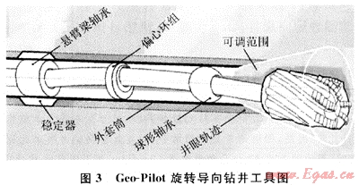 Geo-Pilot[2~3]是一種不旋轉(zhuǎn)套式導(dǎo)向工具(圖3),屬于指向式旋轉(zhuǎn)導(dǎo)向鉆井工具。它不是靠偏心穩(wěn)定器的翼肋推靠井壁偏置鉆頭進(jìn)行導(dǎo)向,而是靠不旋轉(zhuǎn)套與萬向短節(jié)之間的一套偏心機(jī)構(gòu)使萬向軸偏置,從而為鉆頭提供了一個(gè)與井眼軸線不一致的傾角,產(chǎn)生導(dǎo)向作用。該機(jī)構(gòu)由幾個(gè)可控制的偏心環(huán)組合而成,當(dāng)井下自動(dòng)控制完成偏心環(huán)組合之后,該機(jī)構(gòu)將相對(duì)于不旋轉(zhuǎn)套固定,從而始終將萬向軸向固定方向偏置,為鉆頭提供一個(gè)方向固定的傾角。