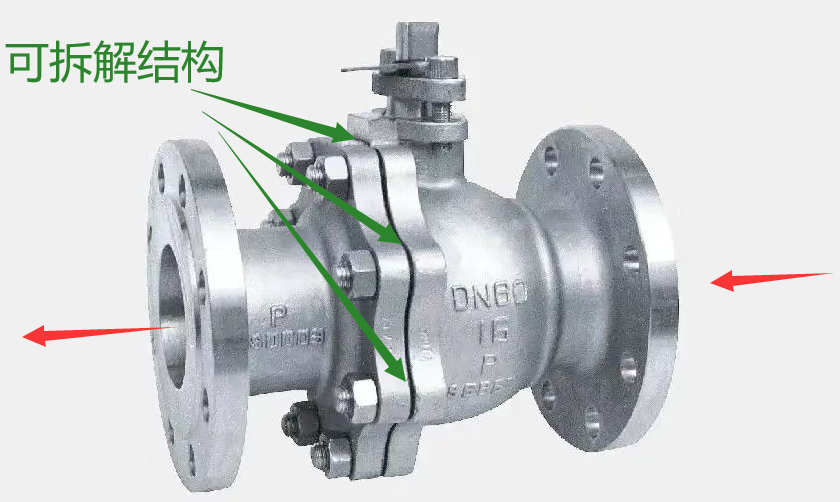 如果上述的球閥安裝方向分正反的話,那這種常見的球閥我想是不是也該按紅色箭頭安裝方向進(jìn)行安裝。因?yàn)橛覀?cè)也是一個(gè)可拆解的結(jié)構(gòu)(猜測(cè)很難拆解,但維修過閥門的都知道,另外閥門本體此處泄漏的可能性有多少?)。