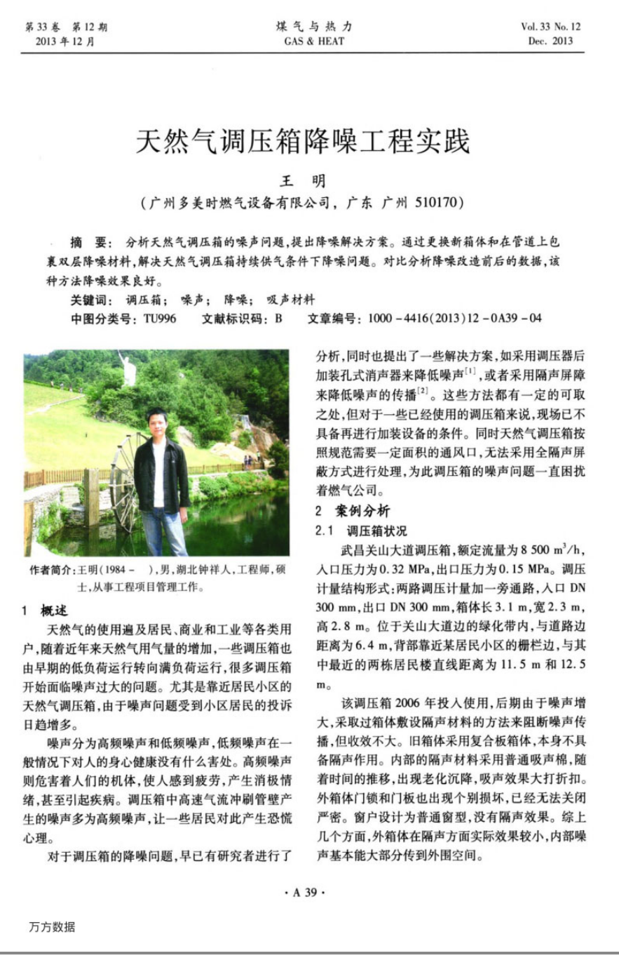 摘要:分析天然氣調(diào)壓箱的噪聲問題,提出降噪解決方案。通過更換新箱體和在管道上包裹雙層降噪材料,解決天然氣調(diào)壓箱持續(xù)供氣條件下降噪問題。對比分析降噪改造前后的數(shù)據(jù),該種方法降噪效果良好。