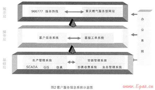 重慶燃氣集團充分利用現代計算機和通訊技術,創(chuàng)建了先進的客戶服務信息系統,包括生產管理、營銷管理、客戶資料、客戶服務工單、966777服務熱線五個方面,整個系統資源共享、無縫銜接,為客戶提供精細服務。服務流程是客戶服務工作的導向,為保證服務流程的統一,集團公司通過建設客戶服務信息系統,對服務流程進行優(yōu)化,并在信息系統中對關鍵流程進行固化。見圖2: