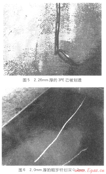 國內(nèi)外法定檢驗機(jī)構(gòu)的檢測結(jié)果表明,雙層環(huán)氧聚合物混凝土結(jié)構(gòu)涂層具有比3PE更優(yōu)異的耐劃傷性(圖5、6)、耐磨損性,其補(bǔ)口處與管體同高,還與陰極保護(hù)系統(tǒng)有很好的匹配性。帕羅特已被美國定向穿越工程承包協(xié)會DC CA(Directional Crossing Contractors Association)指定為定向穿越覆蓋層專用保護(hù)產(chǎn)品。
