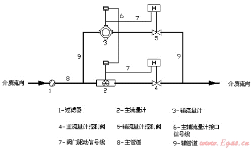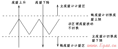 組合式流量計的測量原理是:當通過流量計的流量為零時,主流量控制閥接受主流量計的信號關(guān)閉,輔流量控制閥開啟,此時輔流量計處于等待流量通過的狀態(tài);當輔流量計有流量通過,并且流量低于輔流量計設置的切換流量上限值時,流量經(jīng)輔管線流動,由輔流量計進行計量。當工作流量上升到高于輔流量計設置的切換流量上限值時,則輔流量計發(fā)送電信號至主流量計,然后由主流量計控制閥接受主流量計信號而打開,待主流量計進入計量狀態(tài)后,副流量計控制閥關(guān)閉。當流量下降到主流量計設置的切換流量下限值時,主流量計發(fā)出電信號到輔流量計,輔流量控制閥接受輔流量計的信號而打開,由輔流量計進行計量,主流量計控制閥接受主流量計的信號而關(guān)閉。由于主流量計的下限切換流量與輔流量計的上限切換流量之間存在有一定的閾值,可避免主輔流量計之間頻繁的切換。組合式流量計能根據(jù)工作流量的大小,自動選擇測量范圍不同的流量計進行計量,達到了擴大計量范圍的目的,同時也解決了小流量通過時流量計不計量或計量不準確的問題。