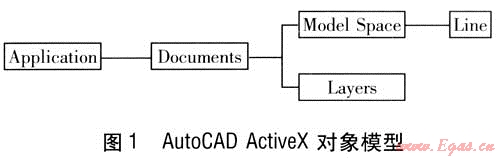 AutoCAD ActiveX提供了各種封裝有AutoCAD功能的對(duì)象,所有的對(duì)象都具有一定的層次關(guān)系,根據(jù)其在AutoCAD中的功能,可以采用樹(shù)形結(jié)構(gòu)表示,稱之為對(duì)象模型(Object Model),本文在AutoCAD二次開(kāi)發(fā)中所用的主要對(duì)象模型見(jiàn)圖1。