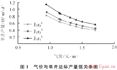 根據(jù)上面研究計算的Ⅰ號氣田3個不同埋深氣藏J3s21(2300m)、J3s23(2450m)、J3s31(2600m)氣價與單井邊際產(chǎn)量值的關系,通過歸納分析,可知隨著氣價上漲單井產(chǎn)量界限值呈冪指數(shù)遞減,當氣價小于1.5元/m3時單井產(chǎn)量界限值遞減較快;當氣價大于等于1.5元/m3時趨于平穩(wěn)(見圖1),說明氣價對難動用儲量的動用影響較大。