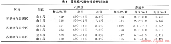 蘇里格氣田主力層二疊系盒8段、山1段儲層形成于沖積背景下的河流沉積體系,河道內部結構復雜,隔夾層發(fā)育,非均質很強。對氣田范圍內93口取心井氣層段巖心分析進行統(tǒng)計,結果表明:孔隙度主要范圍在5%~12%之間,平均值為8.69%;滲透率主要范同為0.1~2mD,平均為0.733mD。各區(qū)塊之間存在一定差異,中區(qū)總體上好于西區(qū)和東區(qū)(表1)。