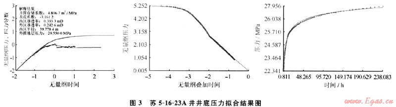 最終得到了該井表皮系數(shù)為-3.16,說(shuō)明是壓裂后受效井,表皮系數(shù)較?。环治鲈摼貙幽P蜑閺?fù)合地層,內(nèi)區(qū)滲透率為0.39mD,內(nèi)區(qū)半徑為39.7m,說(shuō)明近井地帶40m左右是壓裂后滲透性改善區(qū);而外區(qū)滲透率0.2426mD,說(shuō)明壓裂縫外圍地層的滲透情況。