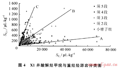 據(jù)此X1井須5段烴源巖以C類為主;須4段以C類、B類為主;須3段以8類為主,少部分偏C類和A類;須2段以A類為主,少部分偏C類和B類;小塘子組以A類為主,見(jiàn)圖4(圖中SC2~5表示酸解烴重?zé)N含量)。
