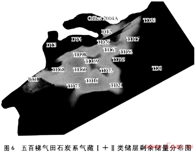 1) 精細(xì)氣藏描述技術(shù)。形成地震儲(chǔ)層預(yù)測(cè)技術(shù)、裂縫精細(xì)表征技術(shù)、氣藏精細(xì)地質(zhì)建模技術(shù)、氣藏開(kāi)發(fā)動(dòng)態(tài)監(jiān)測(cè)技術(shù)、精細(xì)氣藏?cái)?shù)值模擬技術(shù)、剩余儲(chǔ)量描述技術(shù)、治水挖潛增效開(kāi)發(fā)技術(shù)等7個(gè)精細(xì)氣藏描述主體技術(shù)系列。老氣田精細(xì)氣藏描述成為重新認(rèn)識(shí)和評(píng)價(jià)老氣田,弄清剩余儲(chǔ)量分布,明確挖潛目標(biāo),制訂合理開(kāi)發(fā)調(diào)整方案的重要手段。通過(guò)對(duì)五百梯氣田石炭系(圖6)等11個(gè)氣藏進(jìn)行精細(xì)描述,核增地質(zhì)儲(chǔ)量317.16×108m3,增加可采儲(chǔ)量173.41×108m3,延長(zhǎng)穩(wěn)產(chǎn)年限2~5a,提高采收率5.8%~12.5%,效果顯著。