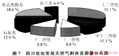 四川盆地天然氣資源豐富,盆地天然氣資源量為10.6×1012m3,按盆地現(xiàn)有探明儲(chǔ)量計(jì)算,探明率僅19.5%。隨著新技術(shù)推廣應(yīng)用和認(rèn)識(shí)深化,盆地二疊系長(zhǎng)興組、三疊系飛仙關(guān)組礁灘以及三疊系須家河組勘探相繼獲得重大突破,資源量還將有較大增長(zhǎng),資源潛力很大。從待發(fā)現(xiàn)資源分布來(lái)看,以上三疊統(tǒng)為最多,占31.1%;其次為中下三疊統(tǒng)-上二疊統(tǒng),占19.9%(圖7)。此外,四川南部地區(qū)下古生界海相頁(yè)巖氣資源豐富,初步估算寒武系筇竹寺組和志留系龍馬溪組頁(yè)巖氣資源量在4×1012m3以上。這些領(lǐng)域都是四川盆地下一步勘探開(kāi)發(fā)的重點(diǎn),也是盆地天然氣持續(xù)上產(chǎn)的重要方向。