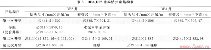 DF2、DP3井采用第三次開鉆井身結(jié)構(gòu),Φ339.7mm表套進(jìn)入中下侏羅統(tǒng)直羅組,封住上部膠結(jié)強(qiáng)度低、疏松、易垮塌地層,第二次開鉆采用Φ311mm鉆頭,下入Φ244.5mm技術(shù)套管封住造斜段。第三次開鉆采用Φ215.6mm鉆頭,為下步完井方式的選擇留有余地,如果獲得理想的自然產(chǎn)能則裸眼完井,若自然產(chǎn)能低先進(jìn)行氣舉、解堵,解堵后仍不能達(dá)到配產(chǎn)要求,可以下5½″尾管射孔完井,對儲層實施壓裂改造[5]。這樣既降低了施工風(fēng)險,又避免了小井眼中實施壓裂改造在工具上的局限性。鉆井實踐結(jié)果表明,這種井身結(jié)構(gòu)是合理的,其結(jié)構(gòu)簡單、施工方便,具有可操作性和經(jīng)濟(jì)性。DF2、DP3井實鉆井身結(jié)構(gòu)如表3所示。