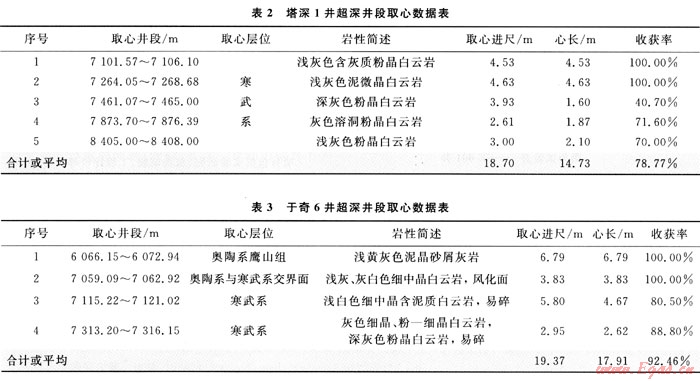 于奇6井是中國(guó)石化西北油田分公司在阿克庫(kù)勒凸起北東斜坡帶布置的一口重點(diǎn)超深探井,位于新疆輪臺(tái)縣境內(nèi),地處沙漠邊緣但靠近天山,完鉆井深7510m,目的層是中-下奧陶統(tǒng)鷹山組、蓬萊壩組和寒武系。本井在超深井段取心4次,使用250P取心工具,取心情況如表3所示。