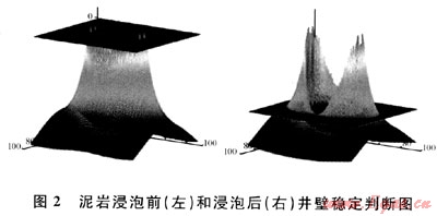 圖2給出了盒1段氣層泥巖浸泡前(左)和浸泡后(右)井壁穩(wěn)定判斷圖。從圖2中可以明顯看出:鉆井液浸泡前井壁穩(wěn)定,只有局部有輕微剝落掉塊;鉆井液浸泡后井壁穩(wěn)定性下降,井壁開始出現(xiàn)大范圍垮塌失穩(wěn)。因此,泡沫鉆井液鉆遇泥巖或泥質條帶存在失穩(wěn)風險。