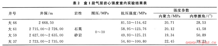 表2給出了盒1段氣層巖心強度室內實驗結果,從表2中可以看出在圍壓為10MPa時,巖石的平均抗壓強度為116.8MPa,而通過模擬計算在氮氣介質下的井內最大應力為93.95MPa,因而不會出現(xiàn)井壁失穩(wěn)[7]