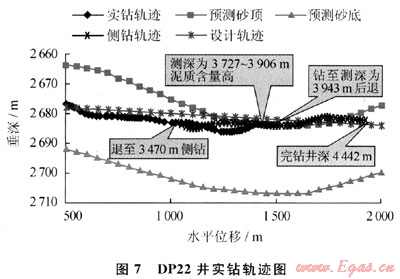 DP22井在水平段的氮氣泡沫欠平衡鉆進過程當中實現(xiàn)了隨鉆點火,火焰高4~6m,后效火焰高9~11m,油氣顯示非?;钴S。DP22井在井深3727~3906m井段伽馬值偏高,判斷為鉆遇泥巖夾層,后退至3470m處進行懸空下切側鉆,后鉆至井深4442m處完鉆,由于后退下切側鉆導致氮氣泡沫實鉆進尺超過1900m。在最后一趟鉆起鉆過程中出現(xiàn)了卡鉆事故。事故原因為沉沙卡鉆,最后一趟鉆總進尺為281.54m,平均機械鉆速為11.04m/h,在鉆井過程中伽馬值偏高,同時出口處沒有巖屑返出。圖7給出了DP22井氮氣泡沫欠平衡水平段實鉆軌跡。