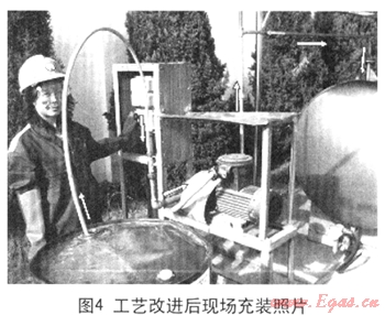我們對加臭劑充裝工藝改進(jìn)后的效果進(jìn)行了評價(jià),發(fā)現(xiàn)最明顯的效果是大大縮短了加臭劑的充裝時(shí)間。將一桶加臭劑充裝到加臭機(jī)的儲液罐,改造前用氮?dú)鈮阂旱某溲b方式確需要2小時(shí),而現(xiàn)在用電機(jī)帶動齒輪泵抽液的充裝方式僅需10分鐘就可完成。另外,由于采用常壓抽取,加臭劑原料桶和抽液管不承壓,減少了超壓變形、破損的可能;而且原料桶內(nèi)的加臭劑可以很干凈的充裝到儲液罐中,減少了浪費(fèi)。圖2為加臭劑充裝工藝改進(jìn)后現(xiàn)場充裝照片。