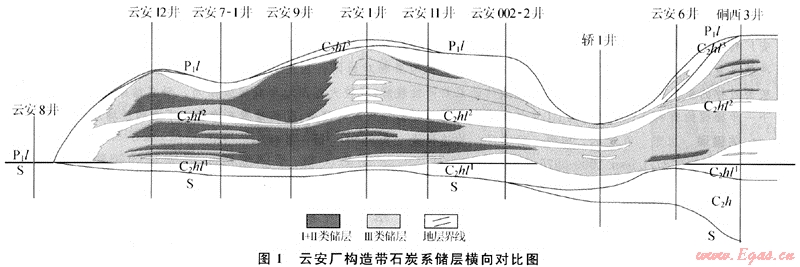 云安廠石炭系勘探失利井主要有:云安5井、云安9井、云安1井、云安7-1井、云安10井、云安12井、云安21井、云安23井、云安8井、硐西1、2、3、4井。失利井大致分為兩大類:一是鉆遇構(gòu)造復(fù)雜帶,二是鉆遇地層水。這些井的失利主要與構(gòu)造模式、構(gòu)造解釋精度有關(guān)。