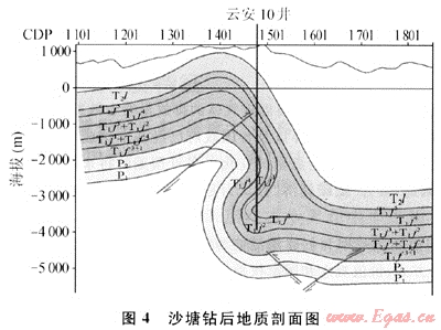 以云安10井為例,該井位于沙塘潛伏構(gòu)造西段近軸部,鉆探目的是了解潛伏構(gòu)造西高點的含流體性質(zhì),為該潛伏構(gòu)造的一口預(yù)探井。設(shè)計石炭系頂界海拔-4520m,預(yù)計井深5520m。實鉆鉆遇構(gòu)造陡帶。