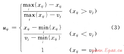 一般情況下,指標(biāo)按性質(zhì)可分為正指標(biāo)、逆指標(biāo)和中性指標(biāo)。此外,由于不同指標(biāo)之間的量綱不一樣,因而也必須對(duì)指標(biāo)數(shù)據(jù)進(jìn)行無(wú)量綱化處理。根據(jù)指標(biāo)性質(zhì)分別為3種類型指標(biāo)設(shè)計(jì)了相應(yīng)的指標(biāo)處理函數(shù)。