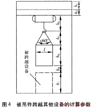 對(duì)于被吊件跨越其他設(shè)備的情況,起升高度需滿足被吊件底部距其所跨越設(shè)備頂部的距離不小于500mm,計(jì)算參數(shù)見(jiàn)圖4。