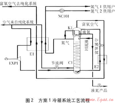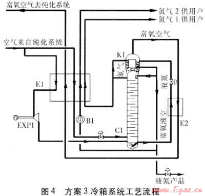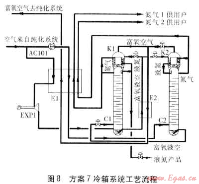 在C1底部產(chǎn)生的富氧液空經(jīng)E2過(guò)冷,節(jié)流后進(jìn)入C2進(jìn)行二次精餾,得到產(chǎn)品氮?dú)饨?jīng)E2、E1復(fù)熱后作為氮?dú)?供用戶。得到富氧空氣經(jīng)E2復(fù)熱,進(jìn)入E1被復(fù)熱到約-145℃后,送入EXP1膨脹制冷后,返回E1被復(fù)熱后,送入純化系統(tǒng)。
