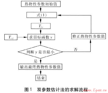 最小時(shí),此時(shí)的熱物性參數(shù)即為所求結(jié)果。雙參數(shù)估計(jì)法的求解流程見(jiàn)圖1。