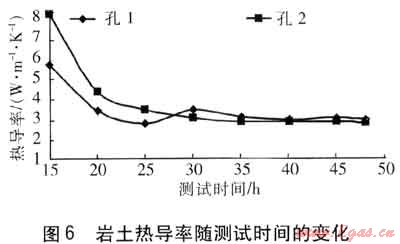 ③ 在實(shí)際測(cè)試中,采用線熱源模型進(jìn)行熱響應(yīng)測(cè)試,測(cè)試至少要進(jìn)行45h才能計(jì)算得到穩(wěn)定合理的巖土熱導(dǎo)率。