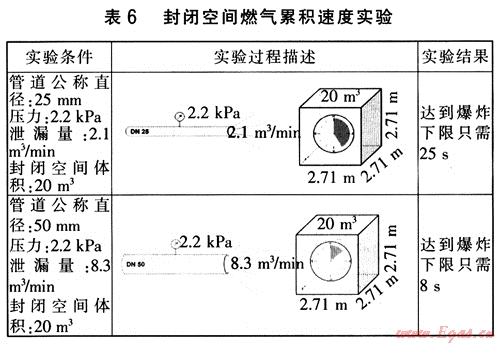 從表6不難看出,燃?xì)庑孤┖笤诜忾]空間的累積速度非???,這就意味著在封閉空間燃?xì)庑孤┓浅NkU(xiǎn)。