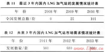 對(duì)LNG燃料汽車發(fā)展進(jìn)度影響最大的是配套LNG加氣站的建設(shè)。目前,我國3大能源企業(yè)(中石油、中石化、中海油)及新疆廣匯、新奧燃?xì)?、中國港華燃?xì)?、華潤燃?xì)獾纫慌鞠嗬^進(jìn)入了LNG替代汽柴油用于新能源汽車的研究領(lǐng)域,并相應(yīng)作出了3~5年建設(shè)LNG汽車加氣站、生產(chǎn)LNG公交汽車和重型卡車的規(guī)劃。表11、12分別是最近3年內(nèi)國內(nèi)LNG加氣站的發(fā)展情況及未來3年的市場(chǎng)需求情況統(tǒng)計(jì)[5]。