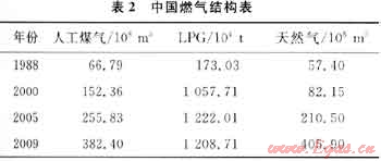 我國將天然氣發(fā)展視為一項(xiàng)能源結(jié)構(gòu)調(diào)整和大氣環(huán)境改善的重要舉措。中國城市燃?xì)膺M(jìn)入了天然氣階段,20世紀(jì)90年代末至21世紀(jì)初,中國建設(shè)了一批天然氣輸送工程,推動(dòng)了城市燃?xì)獾陌l(fā)展——城市燃?xì)馄占奥侍岣?、燃?xì)饨Y(jié)構(gòu)發(fā)生了很大變化(表2)[3]。