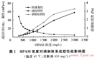 由圖1可見(jiàn),聚合物濃度增加,體系成膠時(shí)間縮短。同時(shí)形成的弱凝膠強(qiáng)度隨著HPAM濃度的增加而增強(qiáng)。但當(dāng)HPAM濃度大于2000mg/L時(shí),雖然凝膠強(qiáng)度增加到1Pa以上(按凝膠強(qiáng)弱分級(jí)為較強(qiáng)凝膠),但成膠時(shí)間縮短到10h以下,這在大劑量深部處理時(shí)易導(dǎo)致前期調(diào)剖劑段塞反應(yīng)太快而使后面的調(diào)剖劑注入困難。此外,HPAM濃度越高,調(diào)剖體系溶液越黏稠,配制及注入都相對(duì)要困難些。在弱凝膠強(qiáng)度及性能滿足作業(yè)要求條件下,低濃度可獲得較低的成本。但濃度不能低于400mg/L,因?yàn)镠PAM濃度在400mg/L以下時(shí)弱凝膠強(qiáng)度很弱,穩(wěn)定1~2周后有少量的游離水,但弱凝膠HPAM濃度在500mg/L以上時(shí),形成的弱凝膠性能則穩(wěn)定。