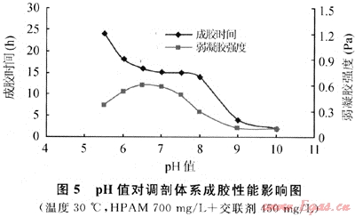 在HPAM/Cr3+交聯(lián)體系中,pH值對(duì)體系溶液是否成膠有著決定性的影響,對(duì)HPAM—YG102-3交聯(lián)體系成膠性能影響實(shí)驗(yàn)結(jié)果見(jiàn)表1、圖5。