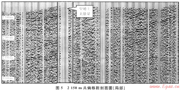 另外,由于該測線穿越的地表起伏較大,受復(fù)雜近地表的影響,野外施工難度較大。為了得到品質(zhì)好的資料,在野外施工中,按照采集規(guī)程,在保證設(shè)計的覆蓋次數(shù)基礎(chǔ)上,選取較好激發(fā)、接收點,采取了較多的變化觀測系統(tǒng),使得炮檢點分布的非常不均勻,局部地段炮點嚴重缺失。從2150m共偏移距分布圖(圖5)看到,該偏移距剖面資料分布嚴重不均勻,局部出現(xiàn)資料大塊缺失,反射同相軸能量中斷,資料存在空道現(xiàn)象嚴重。疊前時間偏移是在共偏移距中進行,這種空間采樣的不均勻,橫向能量差異,在偏移過程中造成能量不能抵消,出現(xiàn)的畫弧使疊前偏移剖面同相軸不連續(xù),是影響成像的主要原因。