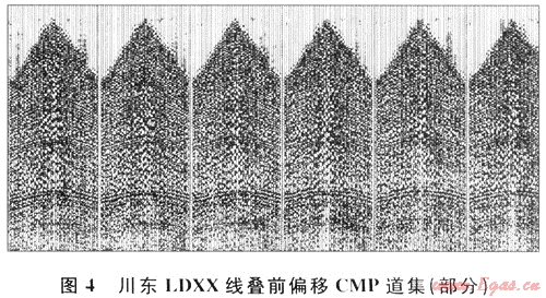 抽取該剖面段的部分輸入道集(圖4為LDXX線偏移前CMP道集),可見信噪比較高,有清楚的反射雙曲線。但仔細對比分析,在道集中局部存在大的振幅值。Kirchhoff疊前時間偏移方法,本質(zhì)是繞射求和。這些大的振幅值或尖脈沖在積分求和的偏移過程中,展開的算子不能被相鄰的其他算子抵消,在偏移剖面上表現(xiàn)為畫弧現(xiàn)象。因此,道集中的噪聲是疊前時間偏移成像變差的因素之一。