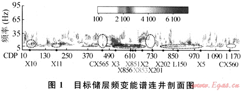 圖1所示是新場T511層頻變能譜連井剖面,重點關(guān)注的頻譜在橢圓區(qū)內(nèi)。圖中顯示,在該儲層段內(nèi),獲得高產(chǎn)工業(yè)氣流的X10、X3、X856、X851、X853、X2、X202等井在低頻段(低于15Hz)具有較強的瞬時譜響應(yīng);獲得低產(chǎn)工業(yè)氣流的IA50、X5等井在低頻段(低于15Hz)具有相對較弱的瞬時譜響應(yīng);未獲工業(yè)氣流的干井X11、CX560井和產(chǎn)水的CX565、X201井在低頻段無強瞬時譜響應(yīng)特征。