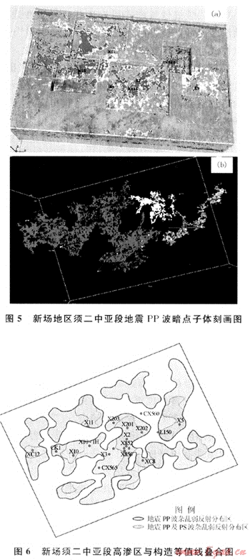 圖5-a為通過(guò)基于小波變換的多尺度吸收增強(qiáng)處理后不同暗點(diǎn)子體在不同時(shí)窗上的可視化立體顯示圖[14],可以看出,宏觀上須二段中部存在5~6個(gè)吸收異常子體,各子體存在于不同的時(shí)間段(或深度范圍),圖5-b為利用像素成像技術(shù)Texture屬性對(duì)暗點(diǎn)進(jìn)行的空間可視化刻畫圖,雜亂反射得以清晰刻畫。